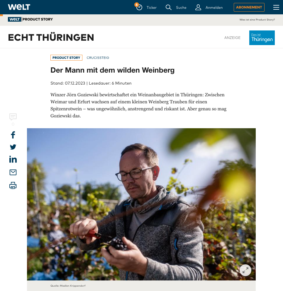 Hopfgarten: ein Dörfchen zwischen Erfurt und Weimar. Hier gibt es einen kleinen, wilden Weinberg, gerade einmal ein Zehntel Hektar groß. Auf dem kleinen, wilden Weinberg wachsen die Trauben für einen der besten Rotweine der Republik, war im „Gault&Millau Weinguide“ Deutschland zu lesen. Das ist Lob von höchster Stelle für die Cuvée „Crucissteig“.